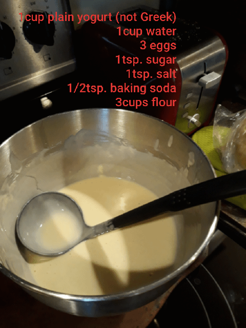 Mix the yogurt with the baking soda and stir well. Add the eggs one at a time and stir good after each egg. Add the flour and sugar slowly and stir well. Heat the oil in a medium sauce pan-should be about an inch deep or a little more (after you can recycle the oil), make sure it’s not really hot, because the doughnuts will be uncooked in the center. I put my stove top on 2. Use a cookie scoop to scoop batter in the pan. You’ll see that they turn over once one side is heated, cook until golden or brown on both sides. I once put salt instead of sugar, and thought they’ll be a waste, but we still ate them, jam and chocolate balanced the flavor.