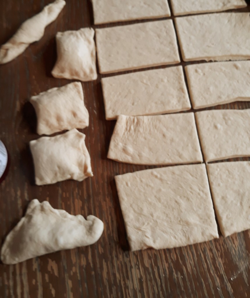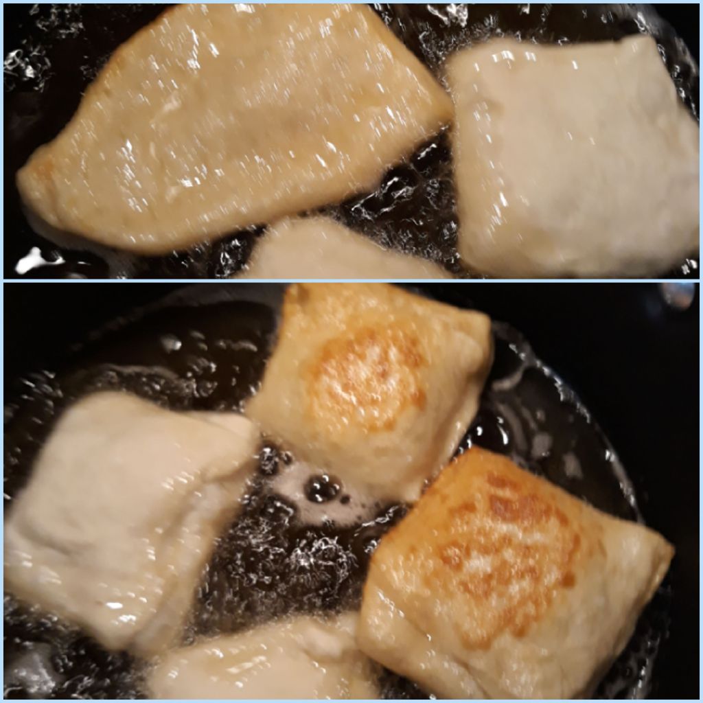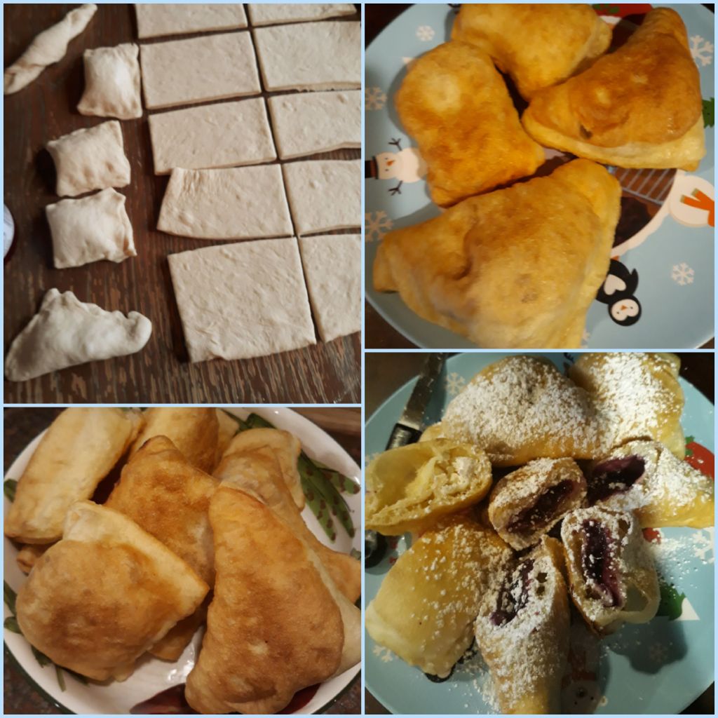 Put all ingredients in a bowl and mix until you make a dough. It should be a little sticky, but easy to remove from the bowl or hands. Let it rise for about 1 hour, or until it has doubled, this will depend on how warm it is in your kitchen. When it’s done rising, put flour on the surface, roll the dough as close as you can to a square, and 1cm thick. Then use a pizza cutter to cut it into squares. Then put the filling on top, and fold one side over the other and press with fingers along the edge. You can make squares again or triangles. For triangles, you simply fold over by taking one corner and connect with the opposite one. Fill a pot or a deeper frying pan about 1 to 2 inches with oil and fry them on medium (later you can recycle the oil),I fried them on 3.