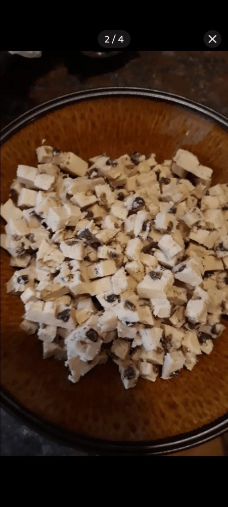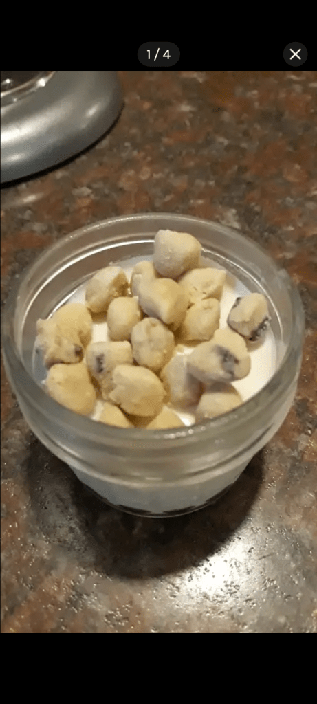 In a jar put a table spoon of yogurt, 1/2 tsp vanilla extract, 1 tbsp maple syrup, the yogurt must have live active cultures. Line a pot with towels and table runner, anything that will keep the milk warm.Bring milk to boil on medium-high to 210°F. Stir consistently so milk doesn’t stick to the pot and burn. When milk starts boiling remove from stovetop. Let it cool to 110°-130°F, about 20 min. There will be a film forming on top of the milk during the cooling, just remove it with a fork. After cooling the milk, pour in the jar and stir quickly, close the jar, put it inside the pot and wrap with the towels really good, cover with the lid, leave in the microwave overnight, and in the morning you should have yogurt. If you want you can pour the milk in smaller jars. When ready put in the fridge for at least an hour or two. Add cookie dough pieces on top before eating, or you can add them after yogurt has been chilled.