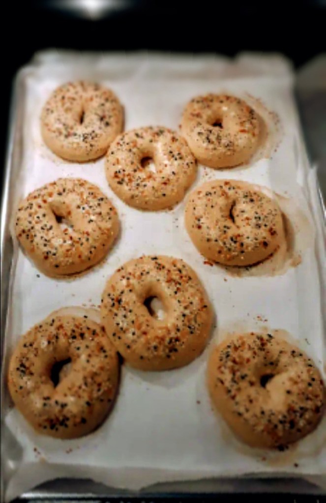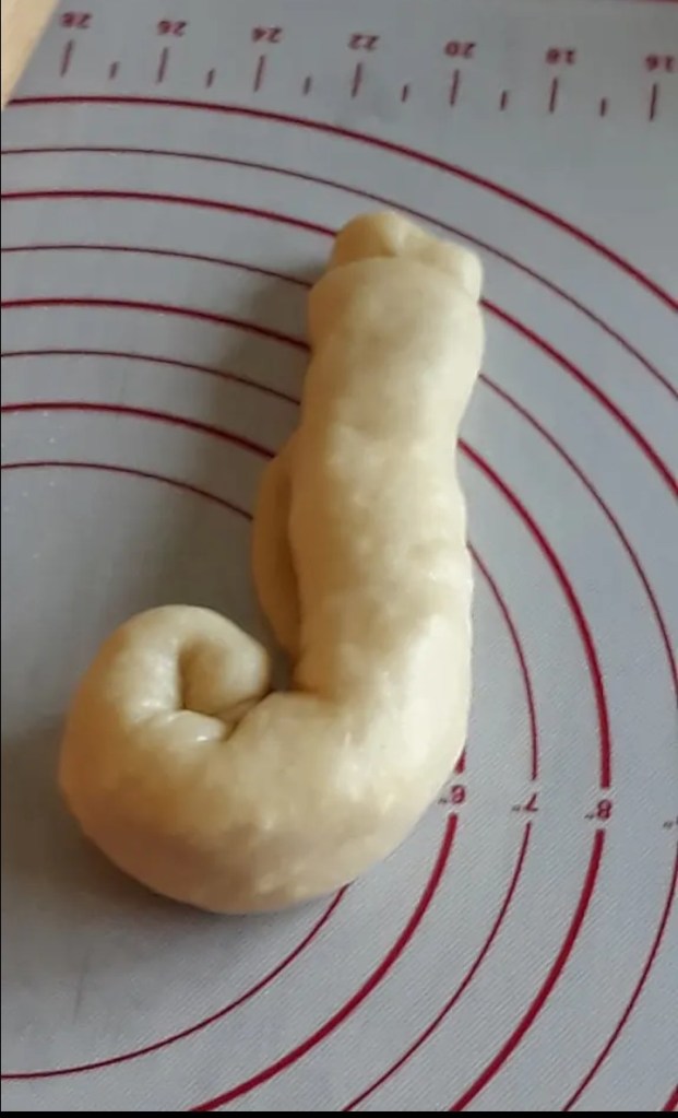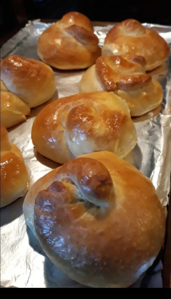 • For the cinnamon twists simply devide the dough and roll like you would make pizza, then cover both pieces with butter, spread the cinnamon and brown sugar mix on one piece and put the other on top buttered side down. Cut lines and twist them. Put them in a pan right next to each other and cover to rise for an hour again.