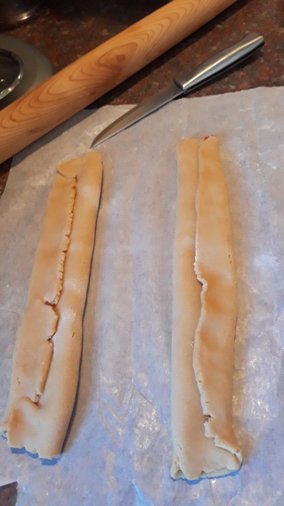 • For the cinnamon twists simply devide the dough and roll like you would make pizza, then cover both pieces with butter, spread the cinnamon and brown sugar mix on one piece and put the other on top buttered side down. Cut lines and twist them. Put them in a pan right next to each other and cover to rise for an hour again.